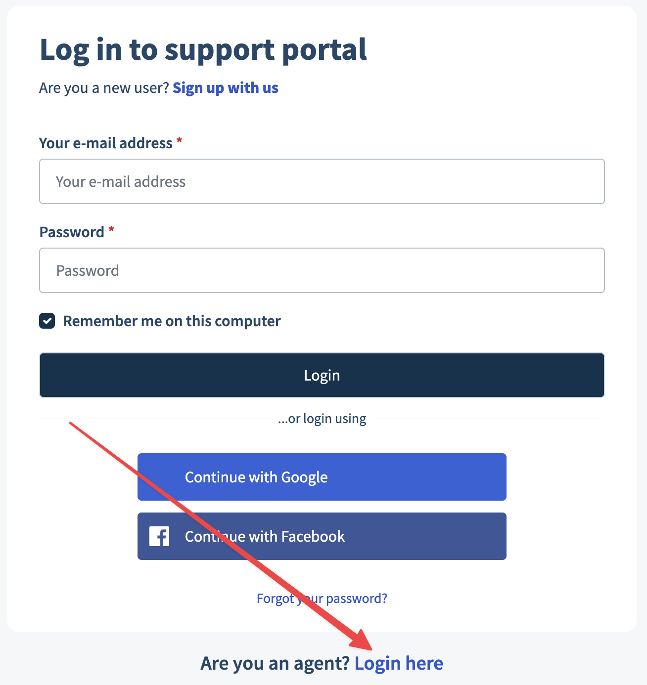 - Click on Login here at the bottom of the login form (red arrow pointing at it)